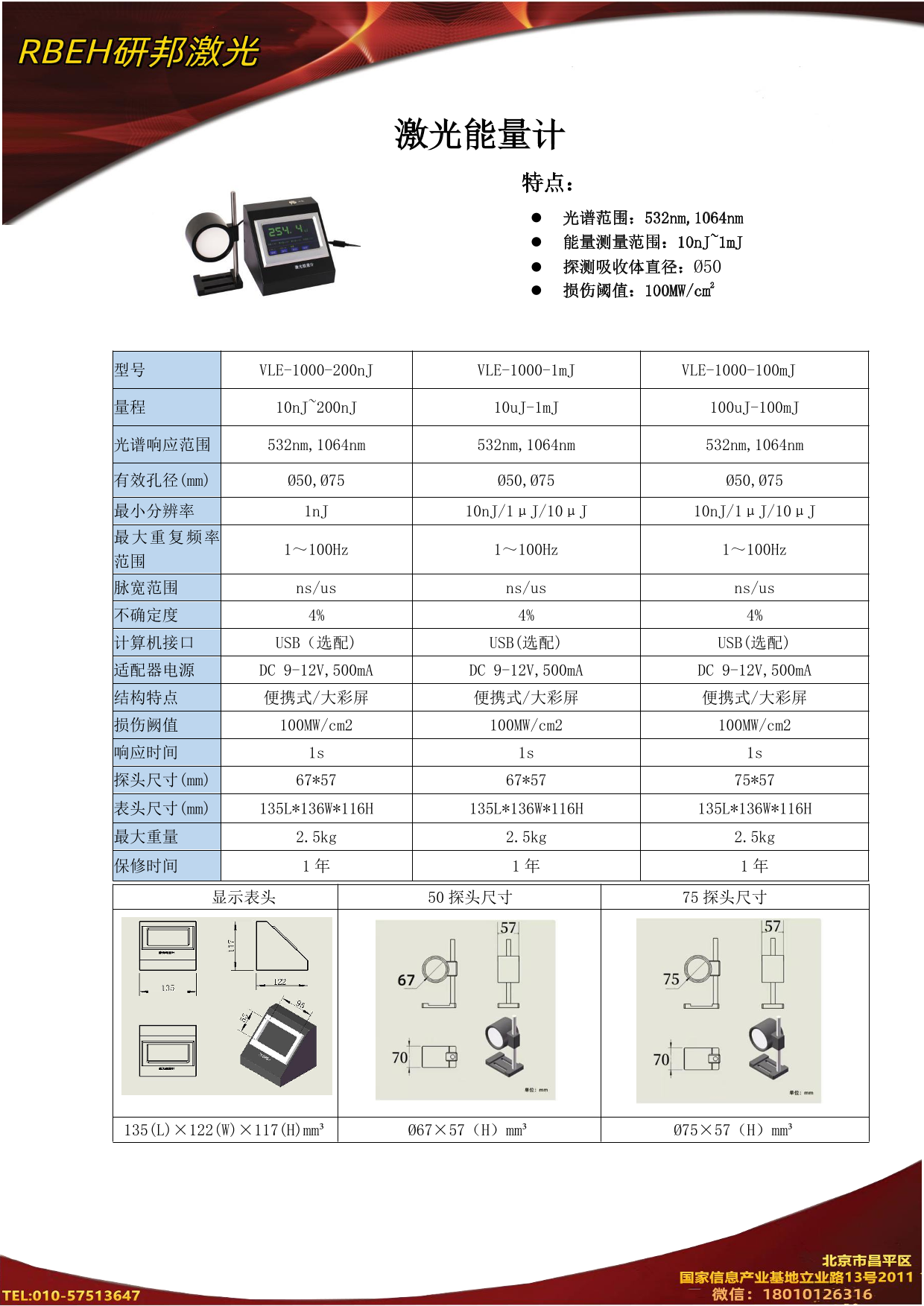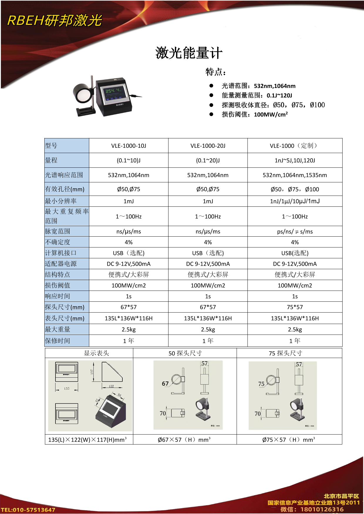 | 500μJ~5J | 1.光谱范围:532nm,1064nm 2.能量测量范围:500μJ~5J 3. 探测吸收体直径:Ø50,Ø75 4.损伤阈值:100MW/cm2 5. SMA905和FC光纤接口(选配) | |||